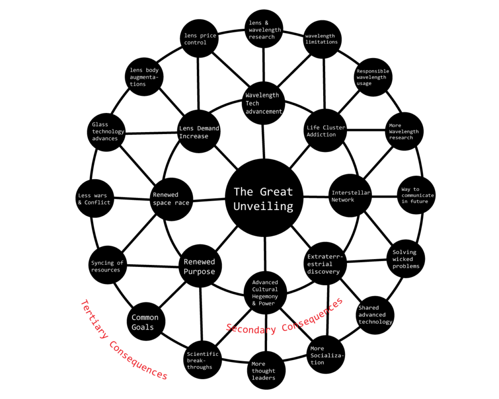 For this project I wish to speculate a pivotal event that may just change how we as humans inhabit the universe. The event is called “The Great Unveiling”, essentially the discovery of a new wavelength which we coined The Liminal Spectrum, shows us that all cosmic entities are connected, similar to a mycelium network but not biological. The Earth, sun, planets and universe all thought to exist in space, has an unseen network flowing through the known universe. Within this network we can tap into a phenomenon that allows us to see nodes where gravity, life, or consciousness cluster.